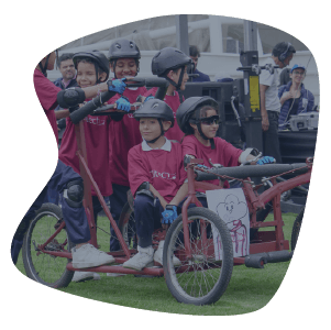 Vehículo tripulado por dos estudiantes. El piloto que conduce y el copiloto que impulsa. Para estudiantes de 4° y 5° de primaria.